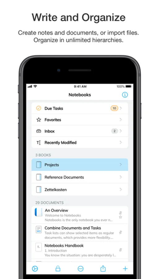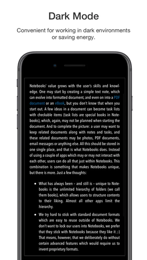 Notebooks is a writing app, a text and markdown editor, your personal Wiki and Zettelkasten, a file organizer, task manager, PDF and eBook creator and more. This may sound like a lot, but consider you have a few text fragments, randomly created, which you want to combine into a chapter of a book and saved as PDF or eBook; or a quick note sparks off an idea, generates a couple of tasks, each of which requires you to organize further research material; or you have business related documents which need to be separated from private diaries, records and files. – With Notebooks you handle these jobs easily without switching apps, and while remaining focussed and creative.