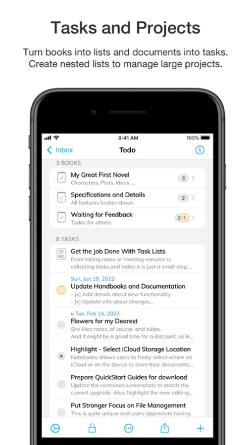 • Turn books into task lists to display document as tasks which can be ticked off. Assign due dates and alerts, and divide projects into nested sub projects, which makes them easier to handle.