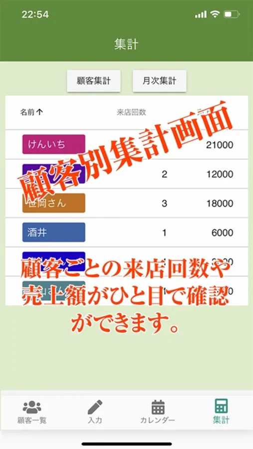 顧客ごとの集計や月別の集計などもできて、確定申告にも役立ちます。