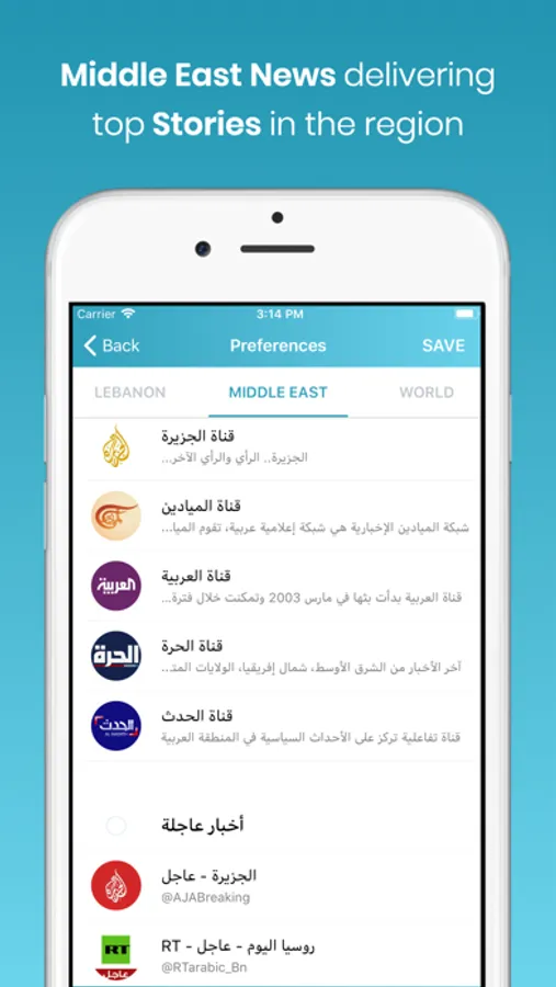 ○ Middle East: Al-Mayadeen, Al-Arabiya & Al-Jazeera News, BBC News & CNN in arabic, Asharq Al-Awsat & AlQuds newspapers, etc.