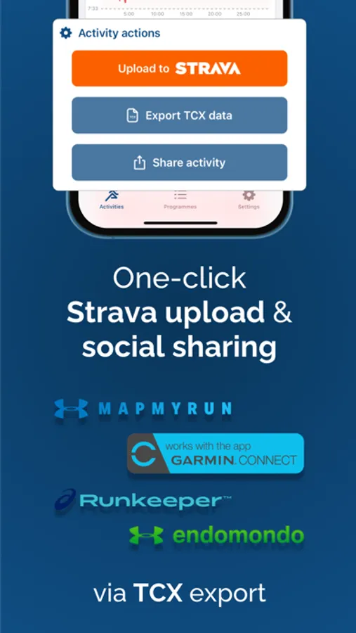 LapTrak integrates with HealthKit and the Health & Activity apps to ensure that your efforts contribute to your daily activities. It integrates with Strava so you can upload your activity with a single click. You can also export an activity in the TCX format to upload to most sports platforms.