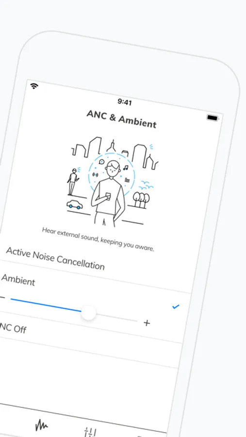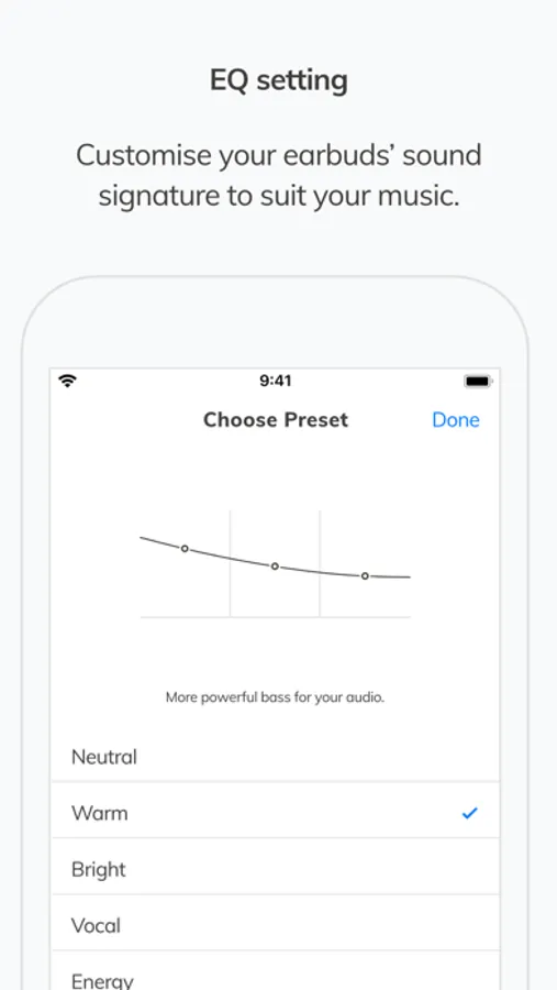 View your headphones' battery levels at a glance. Customise auto-off timer and volume controls.