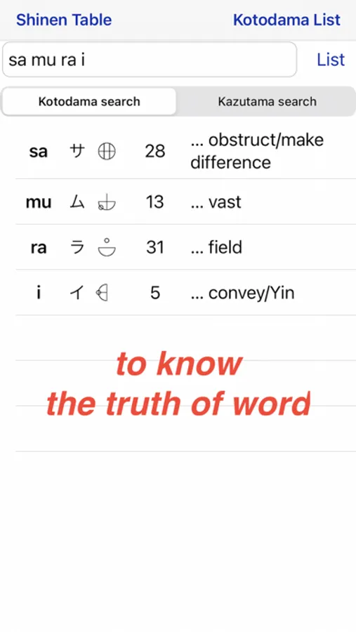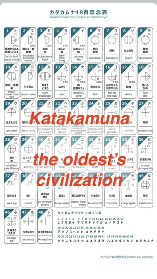 Ms. Nobuko Yoshino, an evangelist of the 48 Japanese sounds, discovered the hidden meaning of each ten years ago and made them a table called 'Shinen table.' The 48 Japanese sounds are in Katakamuna's order in that. Katakamuna is said to be the oldest 's civilization in Japan.