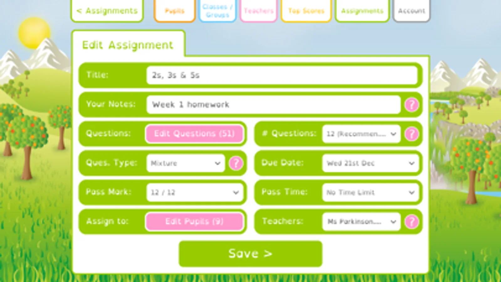- Set assignments for children, with an optional pass mark, pass time and due date.