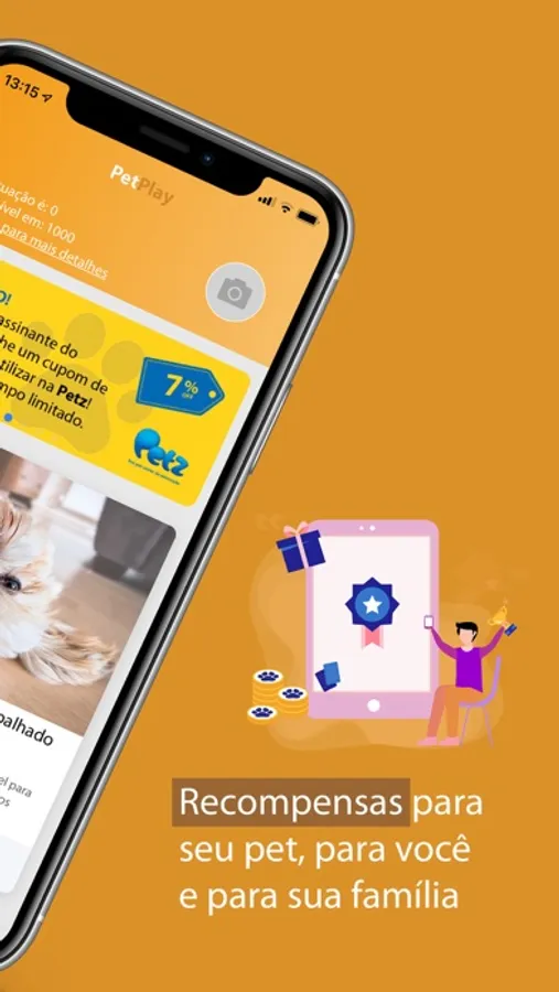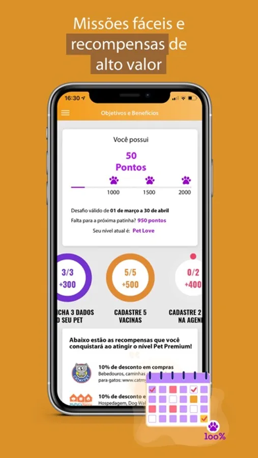 Por apenas R$9,90 mensais, você assina o Pet Play e participa do programa de Objetivos e Benefícios - suas ações dentro do app te recompensam com pontos e, ao atingir o último nível, você recebe acesso a diversos descontos fornecidos pelos nossos parceiros!