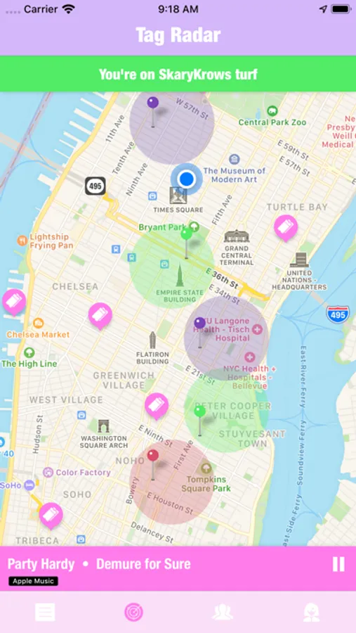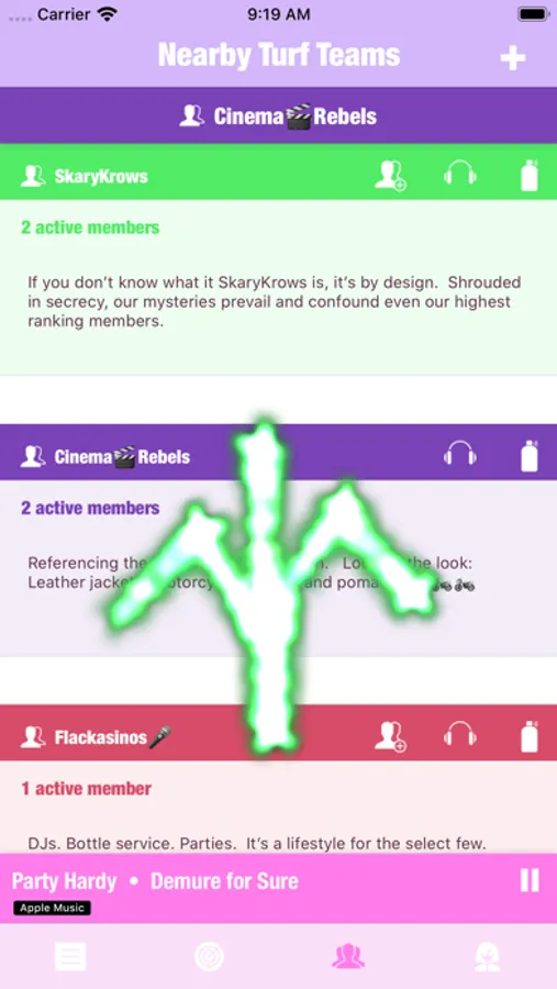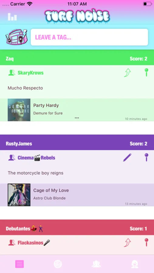 The more active members your Turf Team has, and the more upvotes your tag receives, the higher your tag's score and the more powerful your Turf Team becomes. Tags with high scores remain on the Turf Noise Radar longer. All tags are temporary. Music playback requires an Apple Music subscription, however, users without a subscription can still share songs and messages.