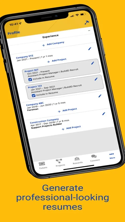 • Generate professional-looking resumes: You can auto create a professional looking PDF resume with just the information that you want to share with someone. You can customize each resume with your specific qualifications, safety training tickets, experience, and projects you have in your construction timeline.