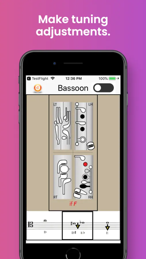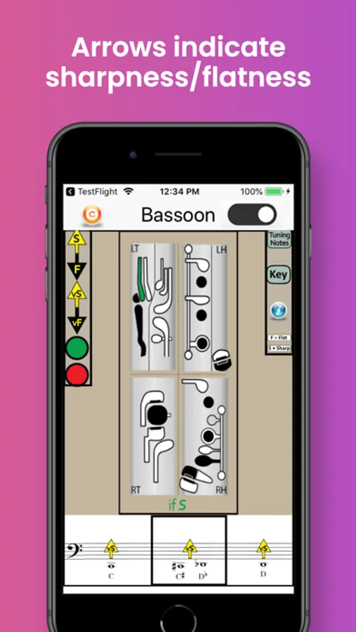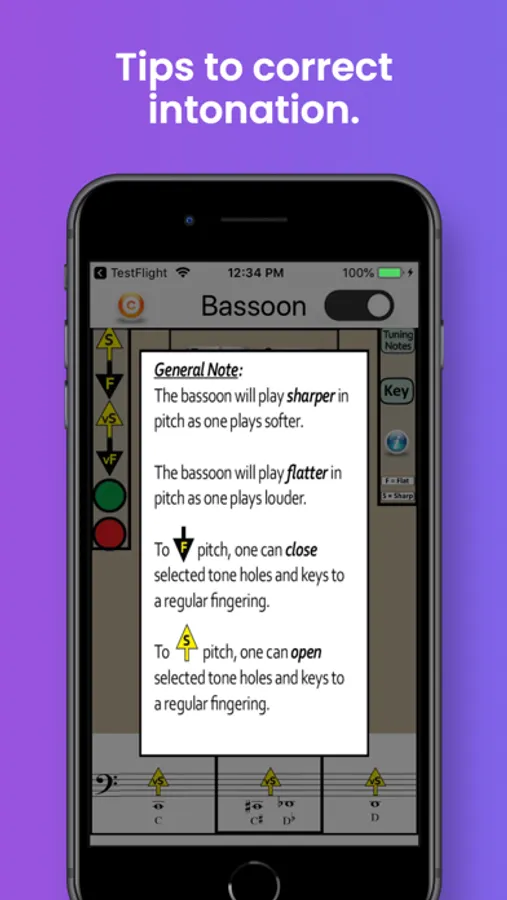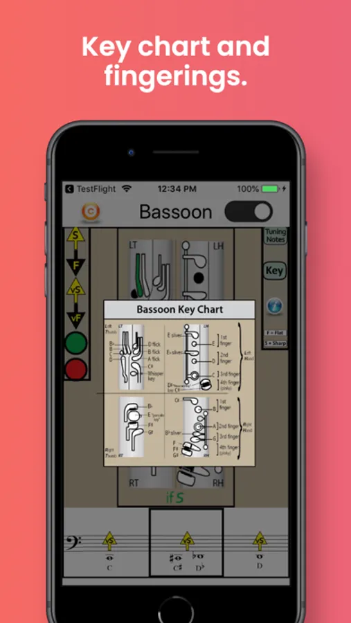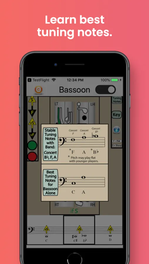 The app also identifies the best tuning notes for bassoon, and the information-button provides helpful tips on tuning the bassoon in relation to dynamics, air speed and direction, and embouchure. A detailed Key Chart allows you to zoom in on particular fingerings and note names.