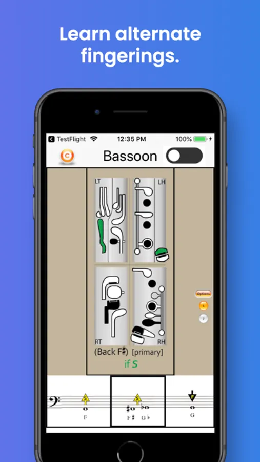 Some notes will display up to three additional alternate fingerings. You will find the options indicated in a menu on the right side of the fingering.