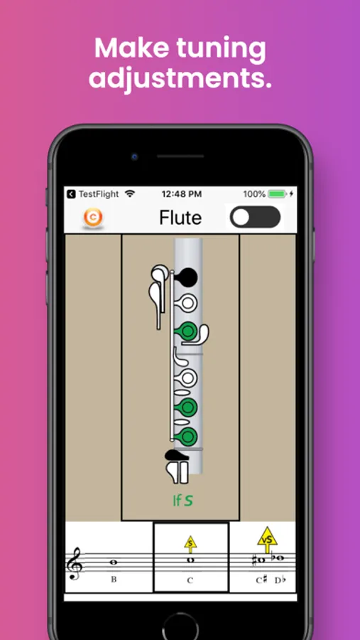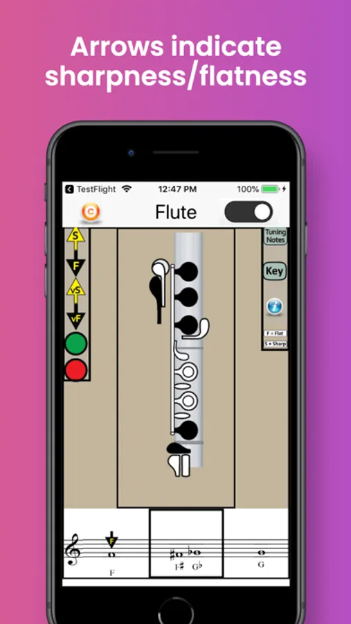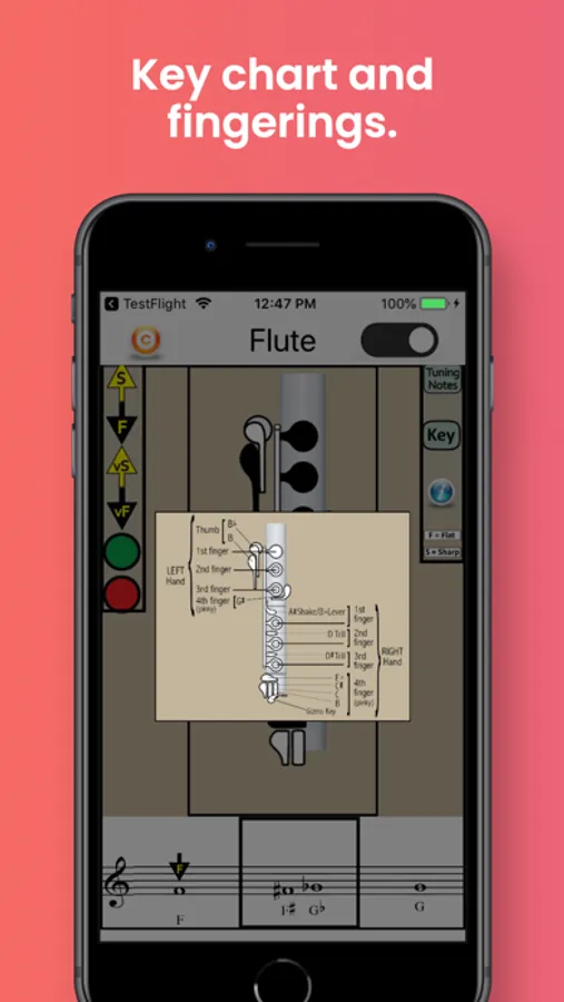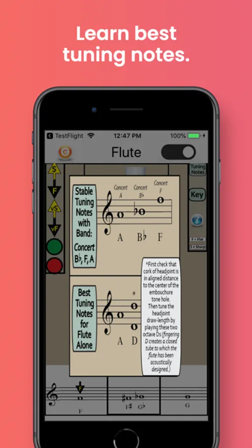 The app also identifies the best tuning notes for flute, and the information-button provides helpful tips on tuning the flute in relation to dynamics, air speed and direction, and embouchure. A detailed Key Chart allows you to zoom in on particular fingerings and note names.