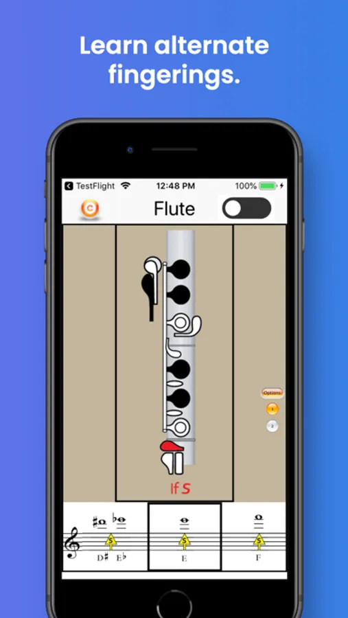 Some notes will display up to three suggested alternate fingerings. You will find the options indicated in a menu on the right side of the fingering.