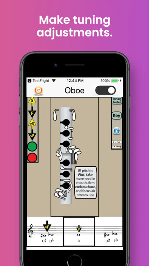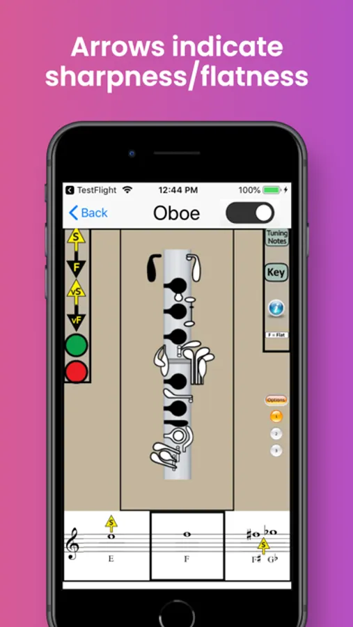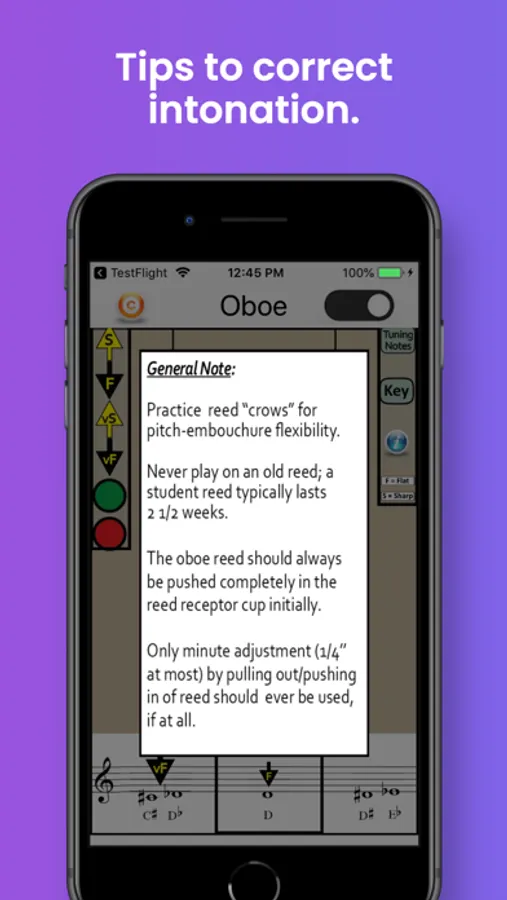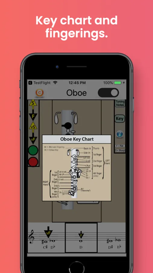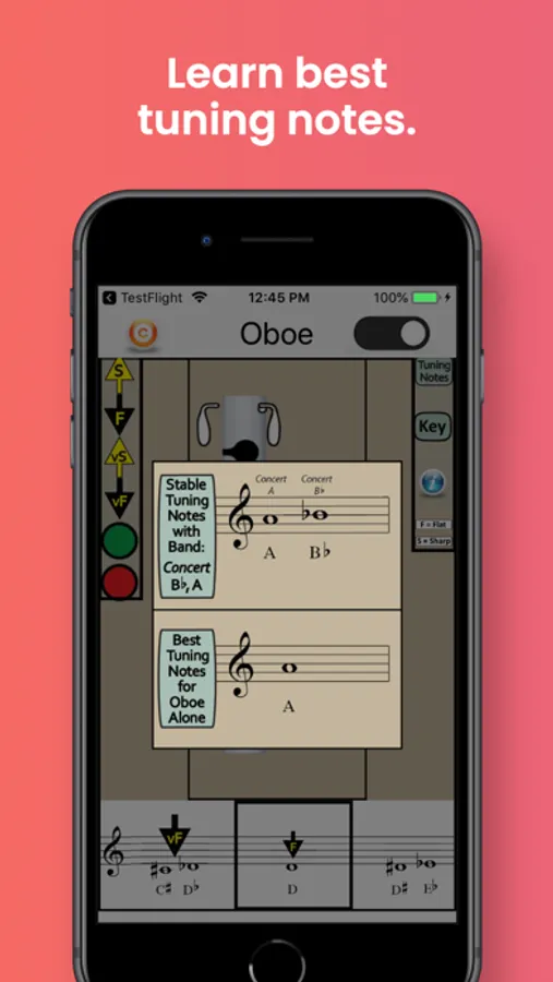 The app also identifies the best tuning notes for oboe, and the information-button provides helpful tips on tuning the oboe in relation to dynamics, air speed and direction, and embouchure. A detailed Key Chart allows you to zoom in on particular fingerings and note names.
