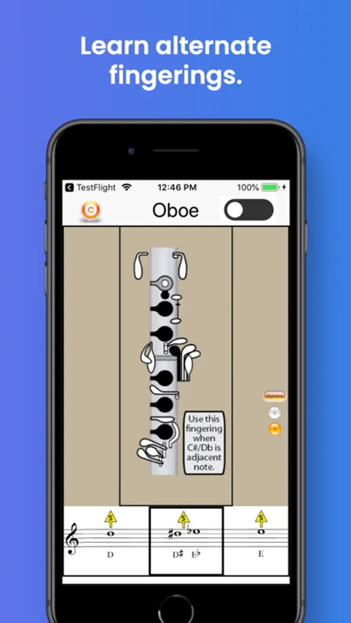 Some notes will display up to three suggested alternate fingerings. You will find the options indicated in a menu on the right side of the fingering.