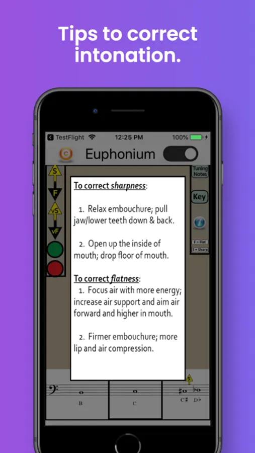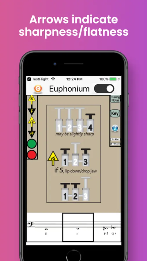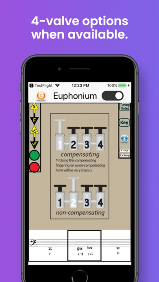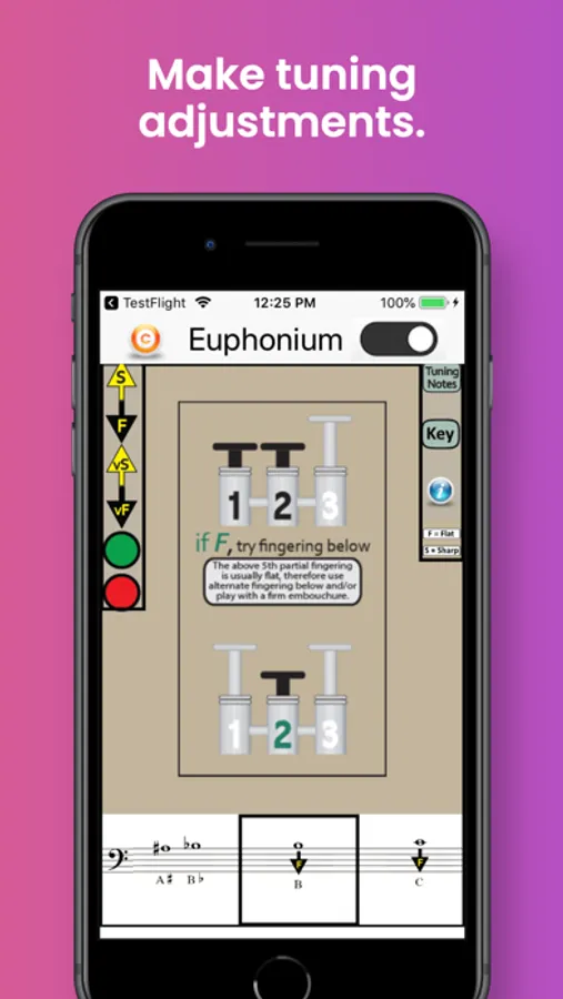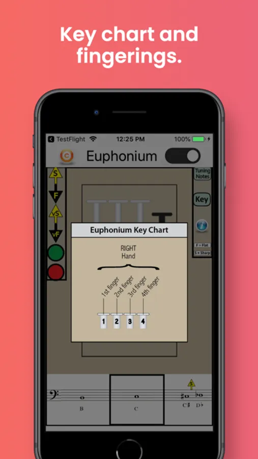 The app also identifies the best tuning notes for euphonium, and the information-button provides helpful tips on tuning the euphonium in relation to dynamics, air speed and direction, and embouchure. A detailed Key Chart allows you to zoom in on particular fingerings and note names.