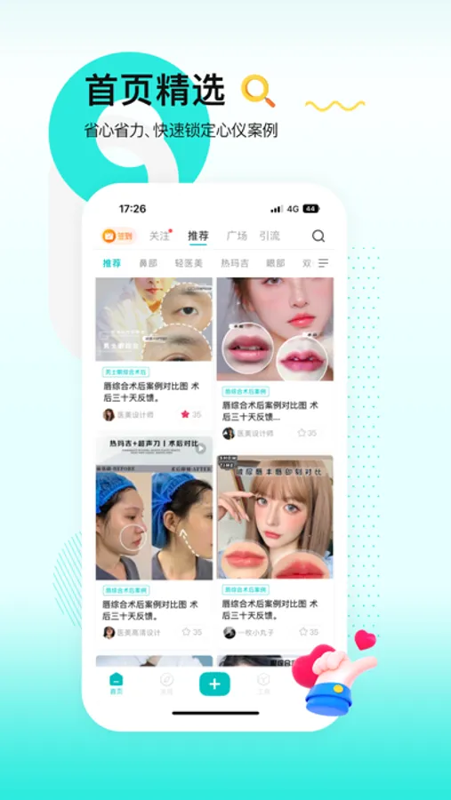 1、更优质的案例:在一美助手APP,每一个你所能看到的案例,都由真实用户反馈,由专业医美设计人员精细打磨,为您呈现视觉感更棒的医美案例