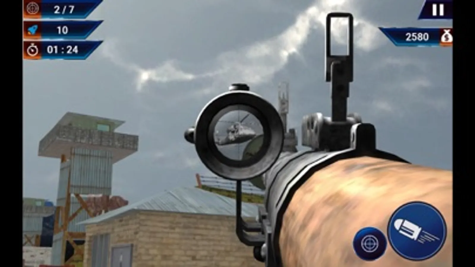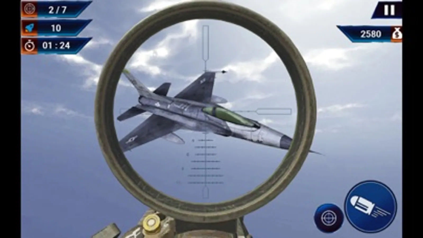 First aim towards enemy fighting airplanes and jets or helicopters by swiping up down or left right on screen and then press aim button to get more clear focused shot through rocket aim sight and then press fire button to launch rocket towards enemy planes.