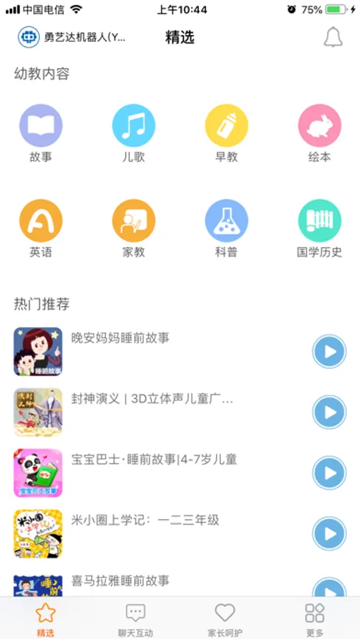 勇艺达视频成长版APP是一款与儿童教育机器人绑定使用的APP,具备资源推送,聊天互动等功能。让家长和孩子可以更紧密的沟通。