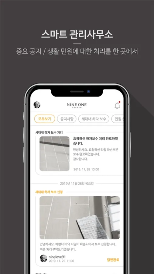 하자 보수 답변 : 입주민이 신청한 하자 보수에 대한 답변