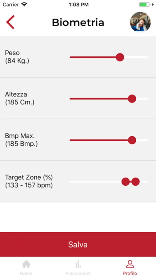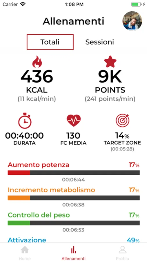 PiùZone traccia il battito cardiaco istantaneo, la permanenza nelle zone cardio, la durata dell’allenamento e le calorie consumate.