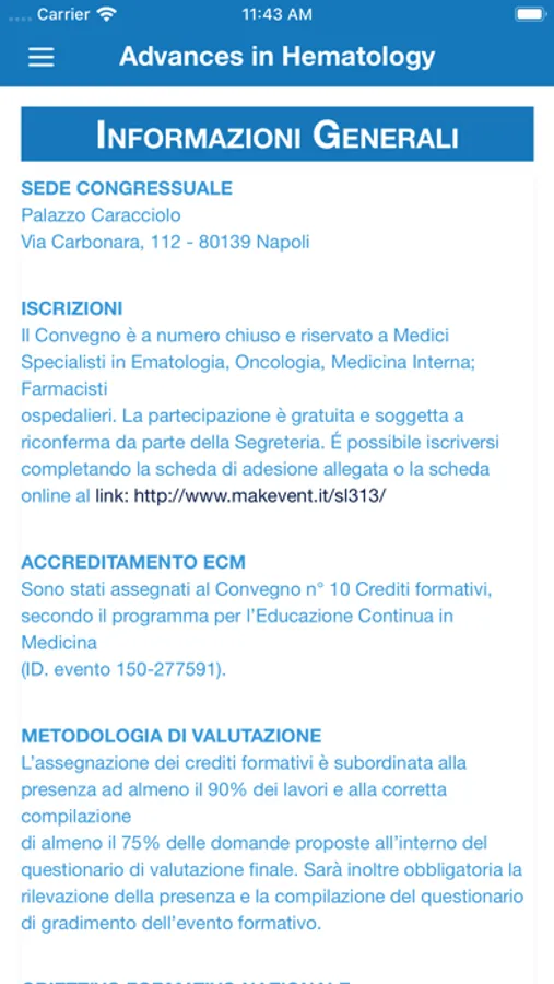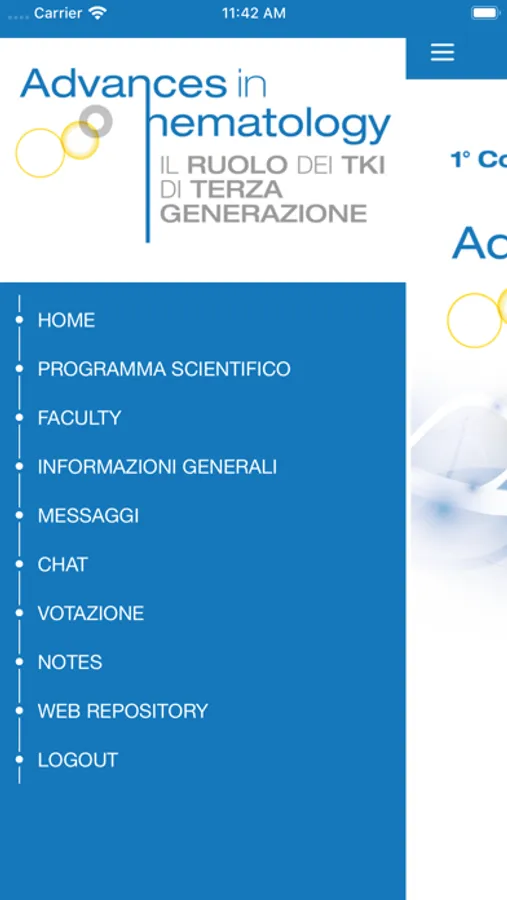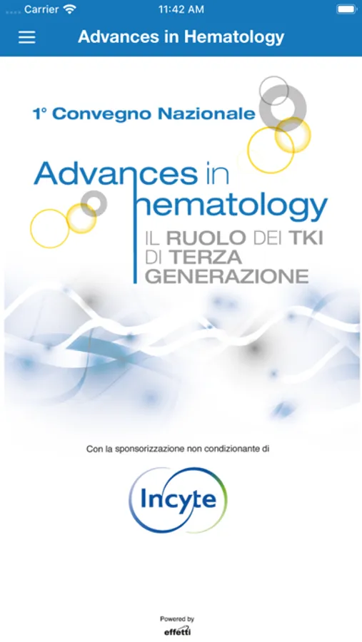 La App è stata realizzata appositamente per il 1° Convegno nazionale Advances in Hematology Il ruolo dei TKI di terza generazione, che si terrà a Napoli in data 16-17 dicembre 2019. Riservata ai partecipanti all’evento e accessibile solo tramite credenziali personalizzate, permetterà agli iscritti di interagire con la manifestazione in tutte le sue fasi.