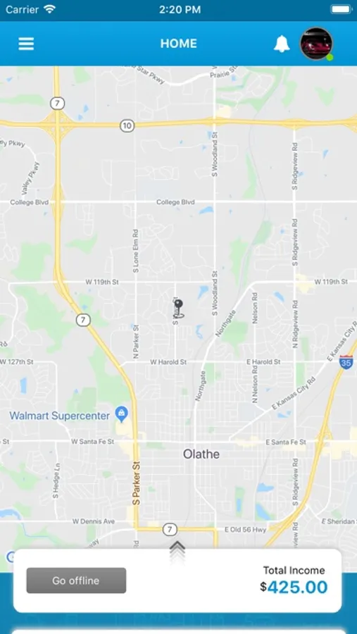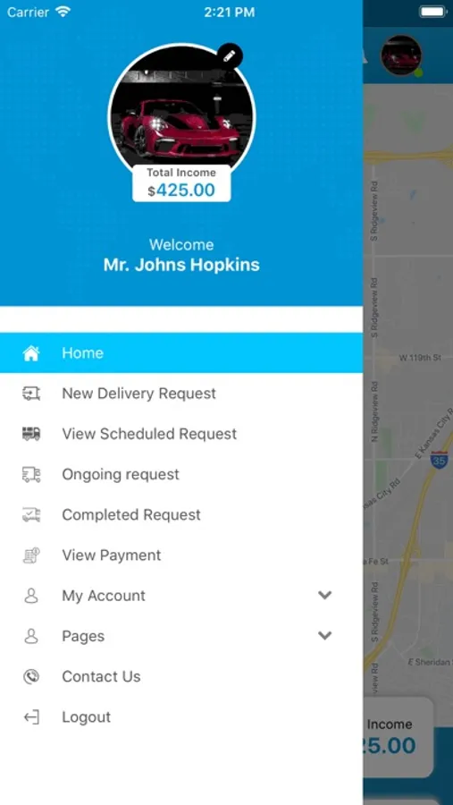 After successful login, driver will see the home screen where he/she can check total income or can change status to offline or online. Driver can check list of all section from click on hamburger icon in the top left corner. In this navigation drawer driver can check all options like New requests, On going requests, Scheduled requests, Completed request, Payment list, Profile, Pages, Logout etc. Driver can change their profile picture from top of navigation drawer.