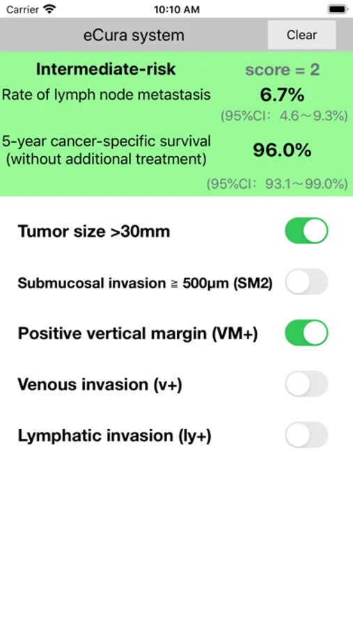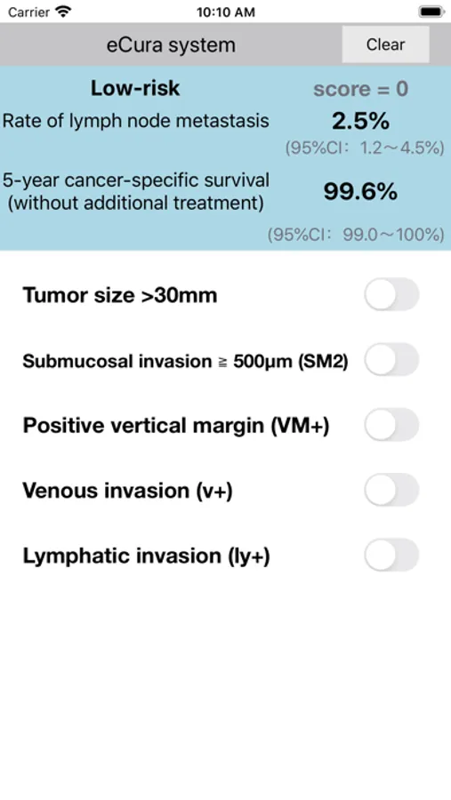 Lymph node metastasis (LNM) was found in only 5–10% of patients with early gastric cancer. The "eCura system" is a scoring system to stratify curability after ESD for early gastric cancer. Five risk factors for LNM were weighted with point values: three points for lymphatic invasion and 1 point each for tumor size >30 mm, positive vertical margin, venous invasion, and submucosal invasion ≥500μm. The patients were categorized into three LNM risk groups: low (0–1 point: 2.5% risk), intermediate (2–4 points: 6.7%), and high (5–7 points: 22.7%).
