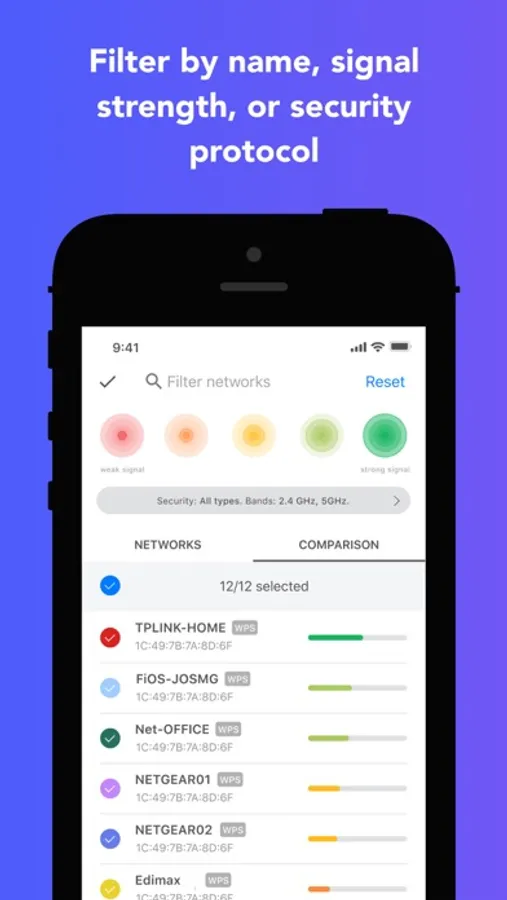 * Use filters for scanned networks: by Name, by Security protocol, by Signal strength, by Band.