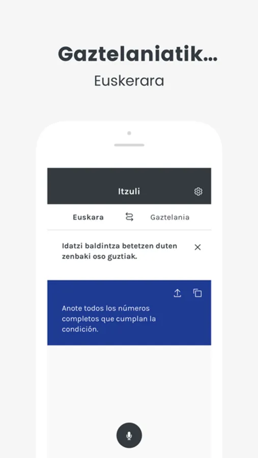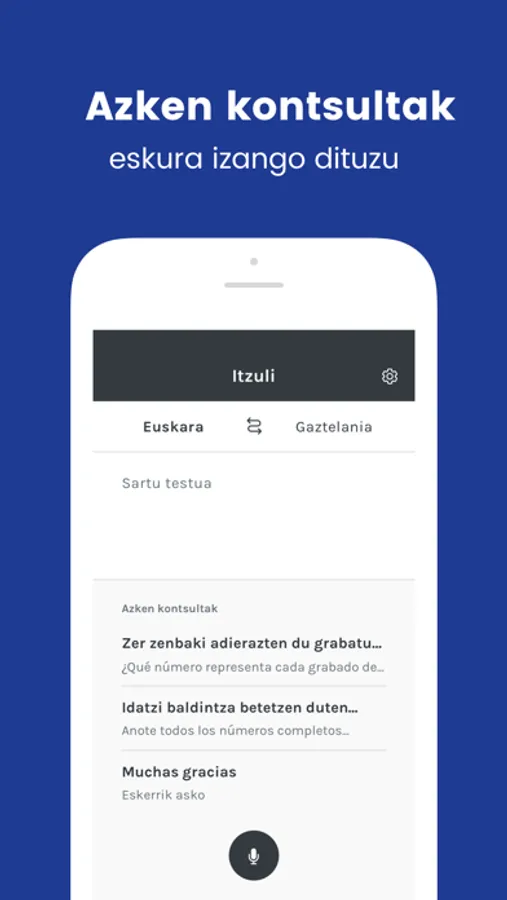Esta aplicación utiliza el traductor del Gobierno Vasco https://www.euskadi.eus/itzuli. El texto que se desee traducir, deberá estar siempre bien escrito. Existe la opción de dictar el texto; para ello, se debe activar la opción de micrófono. En tal caso, preseleccionar la dirección de la traducción. La transcripción a texto se basa en la funcionalidad ofrecida por Apple. Se está estudiando la posibilidad de incorporar mejoras sustanciales en este sentido en versiones posteriores del aplicativo.