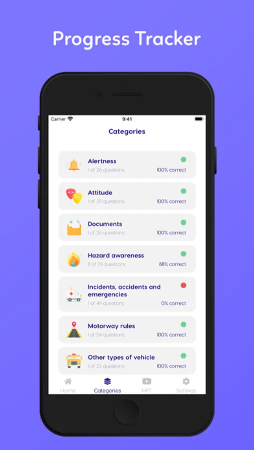 * Progress Tracker - You can see your scores per test, per category, overall progress. Every metric to help you measure your improvement and performance.