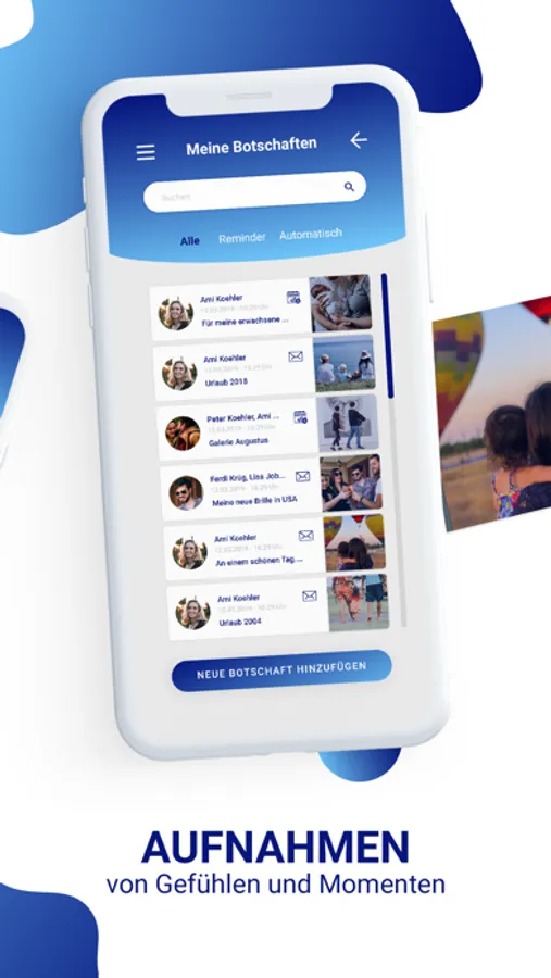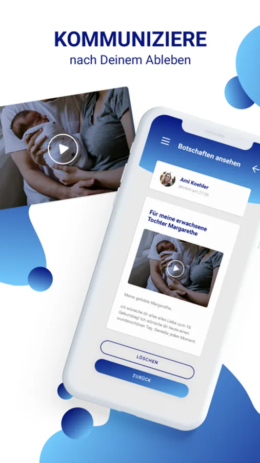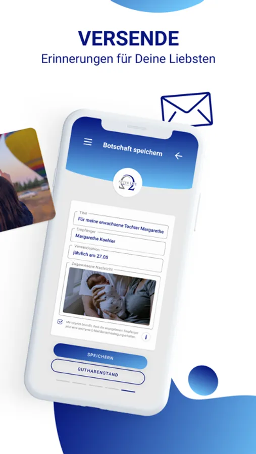 Jeder Mensch möchte sein Leben unterschiedlich festhalten – deshalb gibt es auch verschiedenste Möglichkeiten, Deine Erinnerungen zu hinterlassen. Egal ob Videobotschaften, Sprachnachrichten, Fotos oder einfache Textnachrichten. Egal ob sofort nach Deinem - von zwei Vertrauenspersonen bestätigten - Ableben, oder zeitverzögert zu wichtigen Tagen und Anlässen – After Life Message bietet Dir die für Dich besten Möglichkeiten, Deine Hinterlassenschaft an die von Dir vorgesehenen Personen weiterzuleiten.
