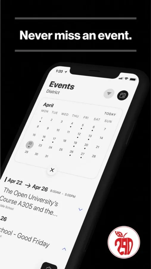 The event section shows a list of events throughout the district. Users can add an event to your calendar to share the event with friends and family with one tap.
