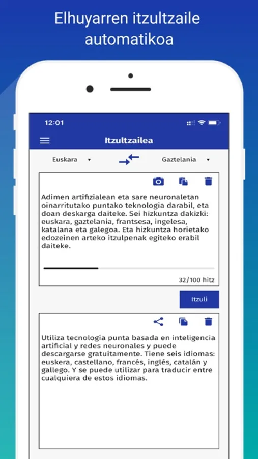 Aplikazio hau Elhuyarren itzultzaile automatikoari dagokio. Adimen artifizialean eta sare neuronaletan oinarritutako puntako teknologia darabil, eta doan deskarga daiteke. Sei hizkuntza dakizki: euskara, gaztelania, frantsesa, ingelesa, katalana eta galegoa. Eta hizkuntza horietako edozeinen arteko itzulpenak egiteko erabil daiteke.
