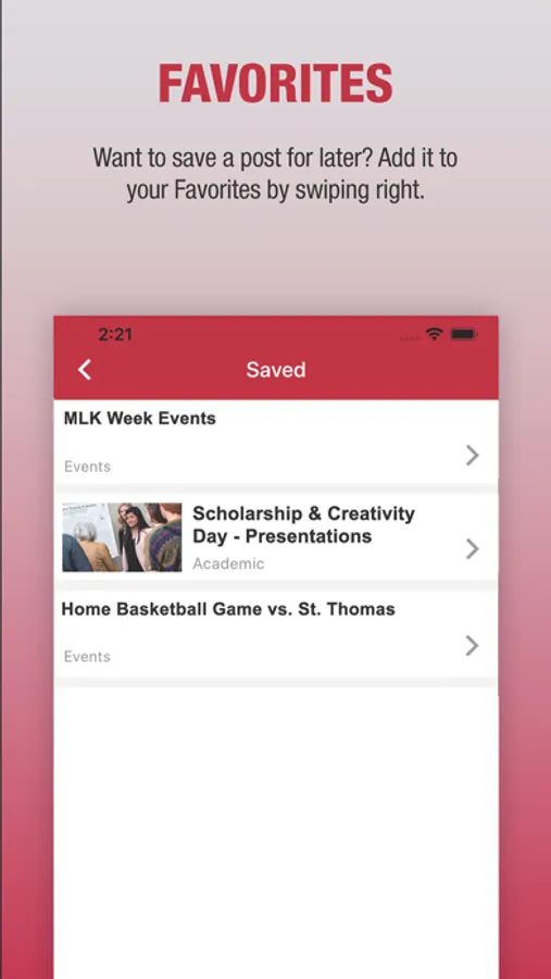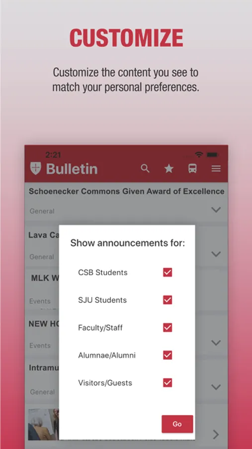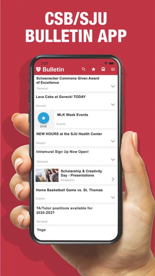 Keeping up with what’s happening at the College of Saint Benedict and Saint John’s University just got easier. The Bulletin app lets you explore campus news, events and updates anytime, anywhere on your mobile device. Easily check the LINK schedule and share stories and information with friends and family. Customize your feed by audience and remove or save posts with simple left-right swipe functionality. Discover new ways to get involved, never miss an important announcement and so much more.
