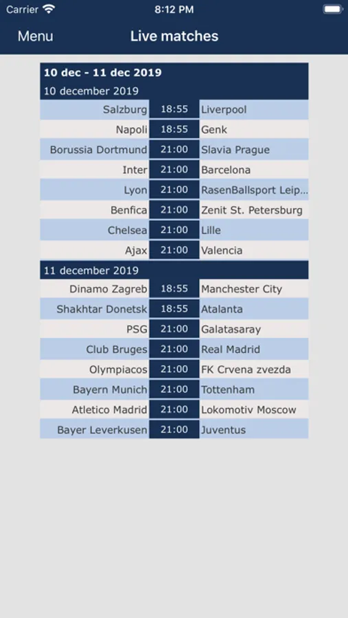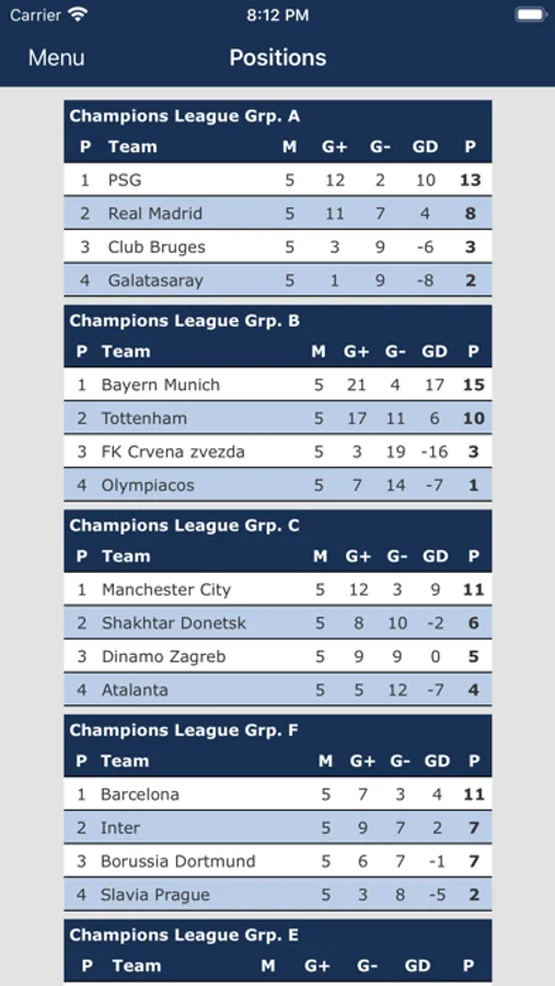 With this application you can follow live all the Champions League matches through online markers. In addition, all relevant information is provided to the competition: positions, results, fixture, scorers and more.