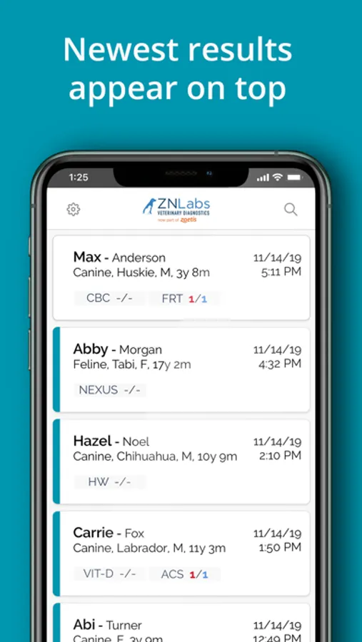The ZNLabs App gives you simple, user-friendly access to all of your recent ZNLabs veterinary reference lab results on your smartphone or tablet - anywhere and anytime.