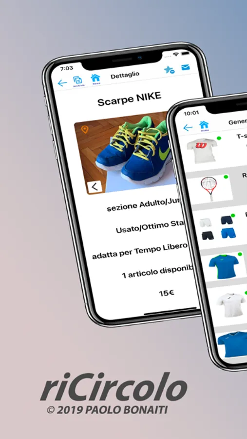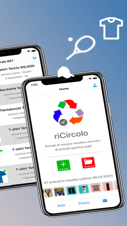 riCircolo è un'applicazione di compra/vendita di articoli sportivi per lo più usati (racchette, abbigliamento, scarpe, accessori ... ), rivolta principalmente ai frequentatori di un'associazione o di un gruppo sportivo.