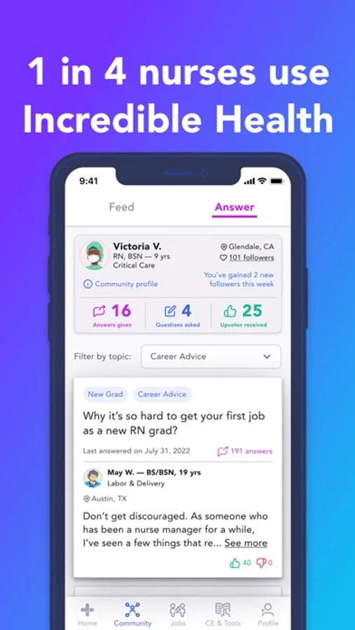 Ask questions, give advice, and share with your nurse community. Looking for career advice or suggestions for dealing with a stressful shift? The Incredible Health nurse community is a thriving and welcoming place for support.