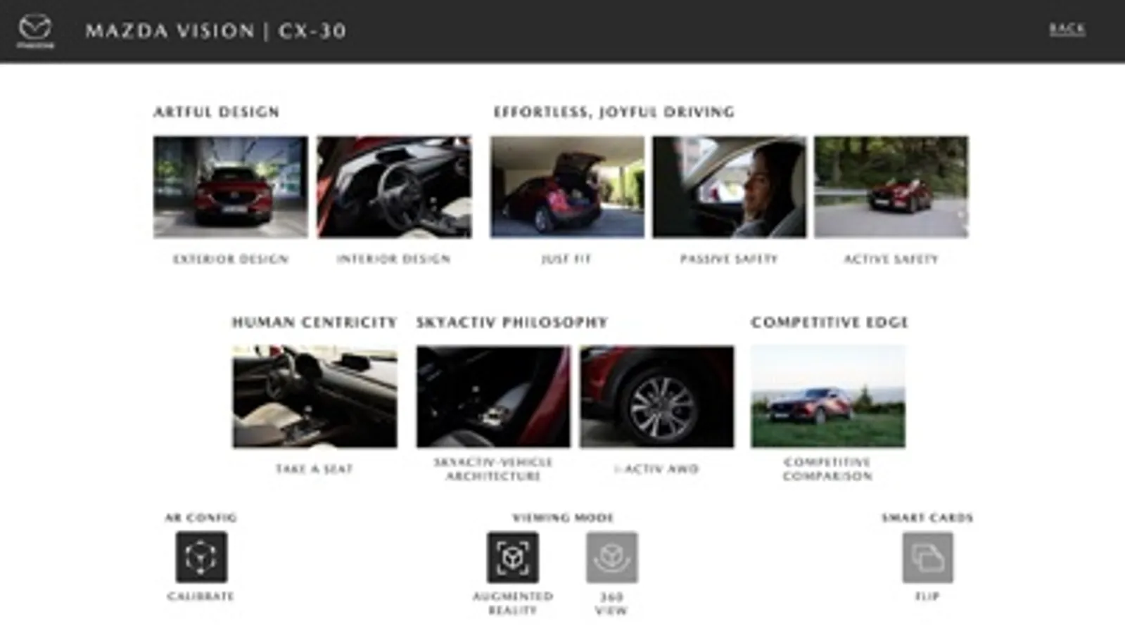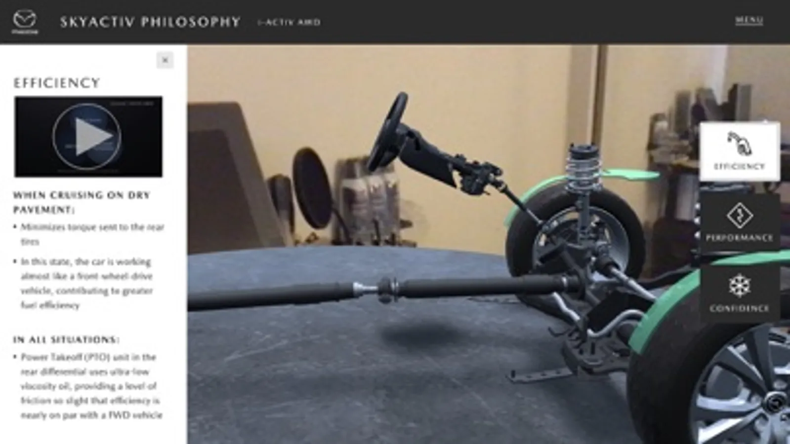 The Mazda Vision Augmented Reality App is an engaging, interactive way for Mazda brand ambassadors and enthusiasts to experience vehicles in the Mazda portfolio. Via Augmented Reality (AR), you’ll be able to explore not only the vehicle’s exterior and interior, but also peel back the layers and take a look at under-the-skin features and technologies such as Mazda’s unique Skyactiv®-Vehicle Architecture and i-Activ AWD®! And, as you engage with the virtual Mazda vehicle, you’ll discover key product stories, competitive advantages and more.