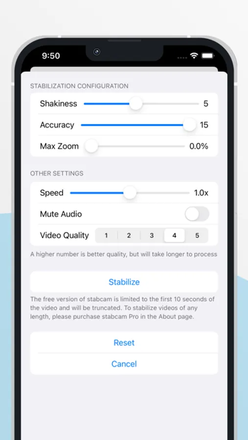 The free version of stabcam allows you to stabilize videos up to 10 seconds in length. You can upgrade to stabcam Pro which handles videos of any length through an In-App purchase.