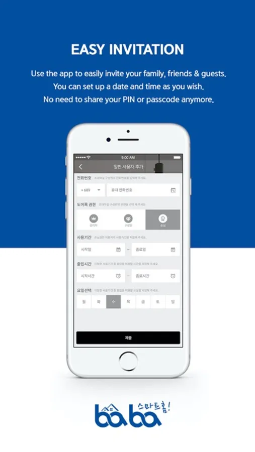 - Through the app, you can set the time period for guests or set a one-time guest password for a temporary visitor. The user can enter and use the authentication number issued without registration.