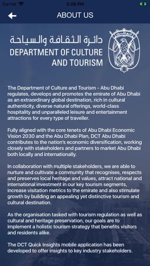 The Department of Culture and Tourism - Abu Dhabi regulates, develops and promotes the emirate of Abu Dhabi as an extraordinary global destination, rich in cultural authenticity, diverse natural offerings, world-class hospitality and unparalleled leisure and entertainment attractions for every type of traveller.