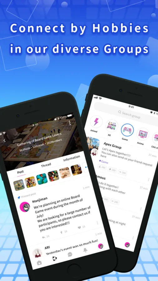 You can join or make groups based on your interests and hobbies! There are various groups for games, anime, music, sports, comics, voice actors, voice immitations, studying, idols, consulting about worries, and more!