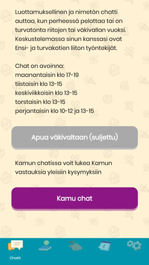 - Chatin, missä voi jutella Turvakamun tai chatin työntekijän kanssa sen aukioloaikoina