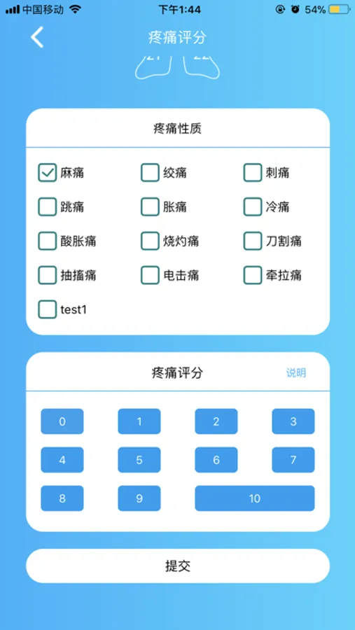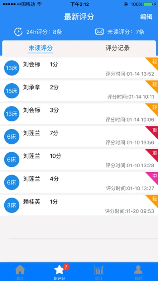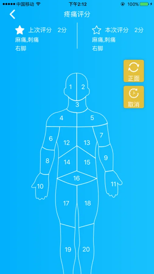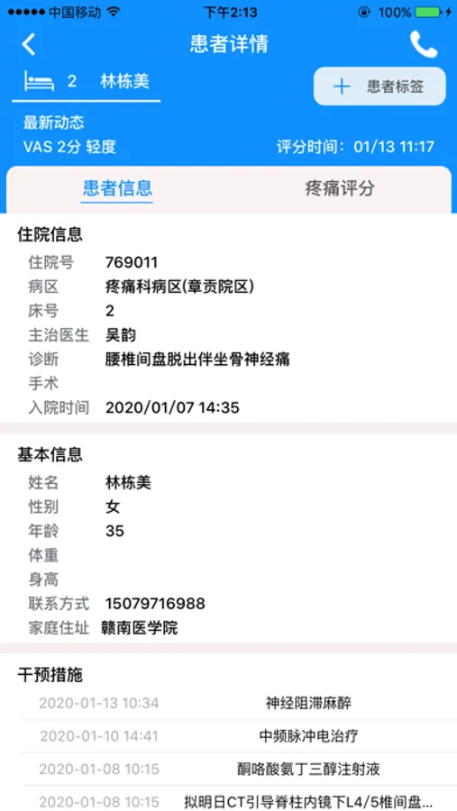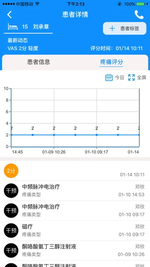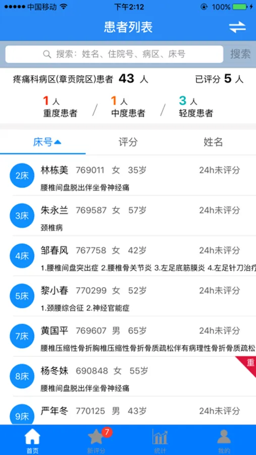 【1】患者列表:可以对患者疼痛情况进行评分,可以切换病区查询不同病区的患者。