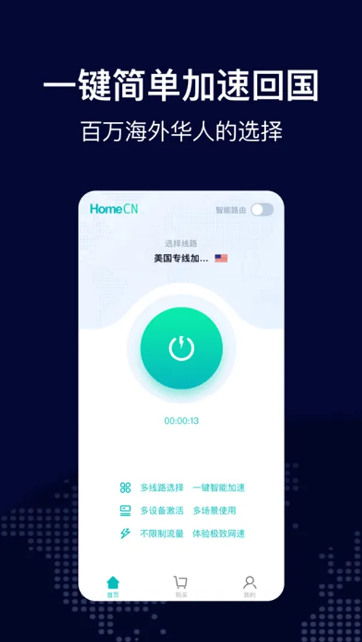 HomeCN是一款专门面向全球华人同胞的加速软件。可以让长期在海外学习,工作,包括旅游的华人可以在不同的地区,观看国内的影视剧,收听音乐,下载国内游戏等等,体验流畅的网络,如在家一般的感觉。