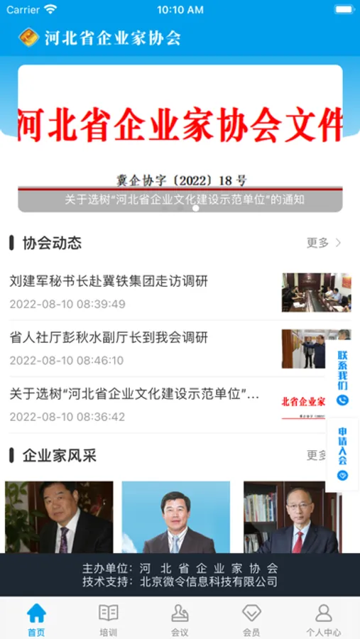 河北省企业家协会成立于1984年,建会三十多年来始终坚持为企业、企业家服务的宗旨,积极开展各项有益于企业的服务活动,目前拥有直属会员近千家,系统会员5000余家。我会连年被省民政厅评为“河北省优秀社团”,被国家民政部授予“全国先进民间组织”荣誉称号。协会紧跟时代潮流,创新服务方式,利用信息化手段,开发出大型移动互联网社交服务平台——线上“河北省企业家协会” 。努力打破时空限制,实现线下与网上服务的有机结合。