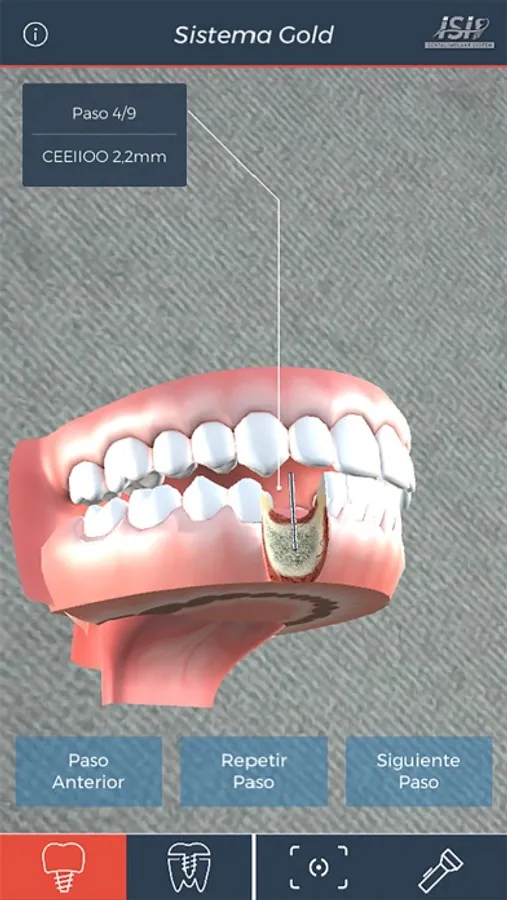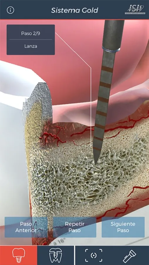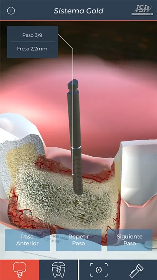ISI Dental permite previsualizar mediante animaciones el proceso de implante Gold. Además se puede adquirir el módulo configurable, paso a paso del proceso de implante MSJR.