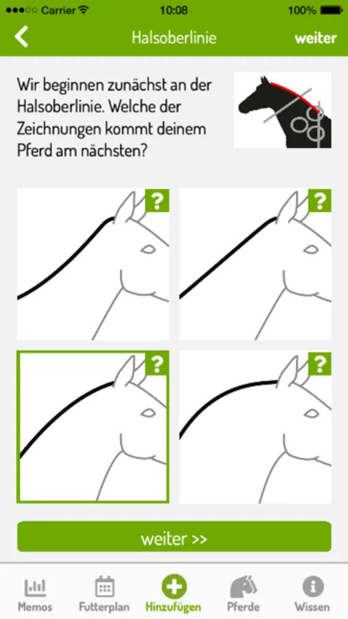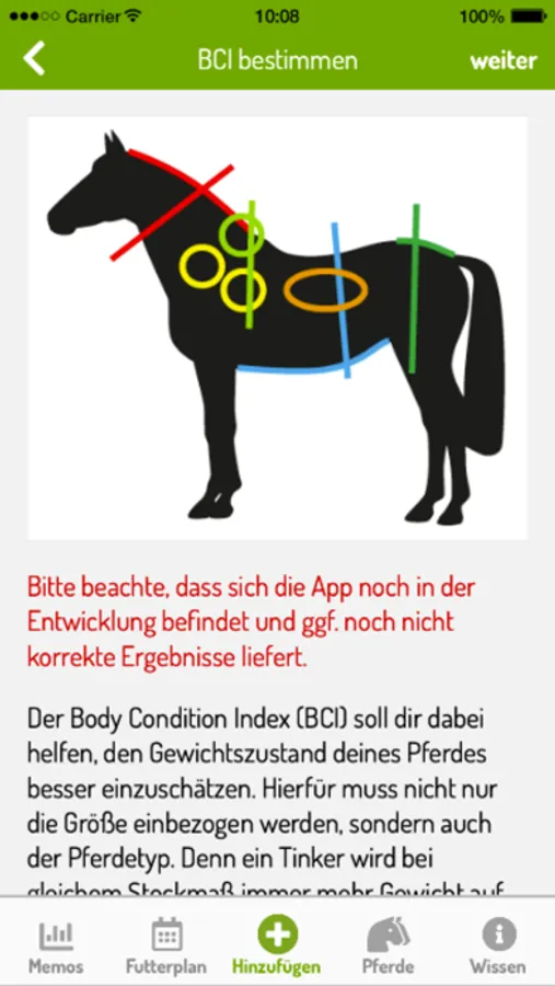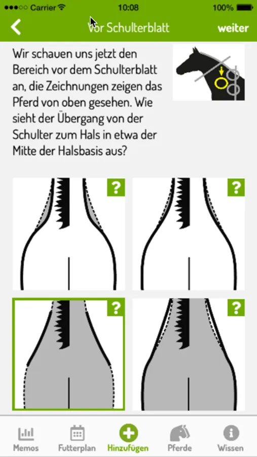The Sanoanimal BCI app supports you in the assessment of your horse. Schematic diagrams guide you step-by-step through the process of assessing the neck, the body, and the croup.
