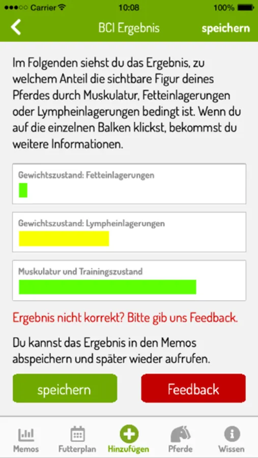 You can save the results and track the development of your horse during, for example, a diet, therapy, or after a change in training.