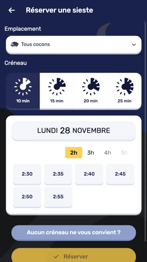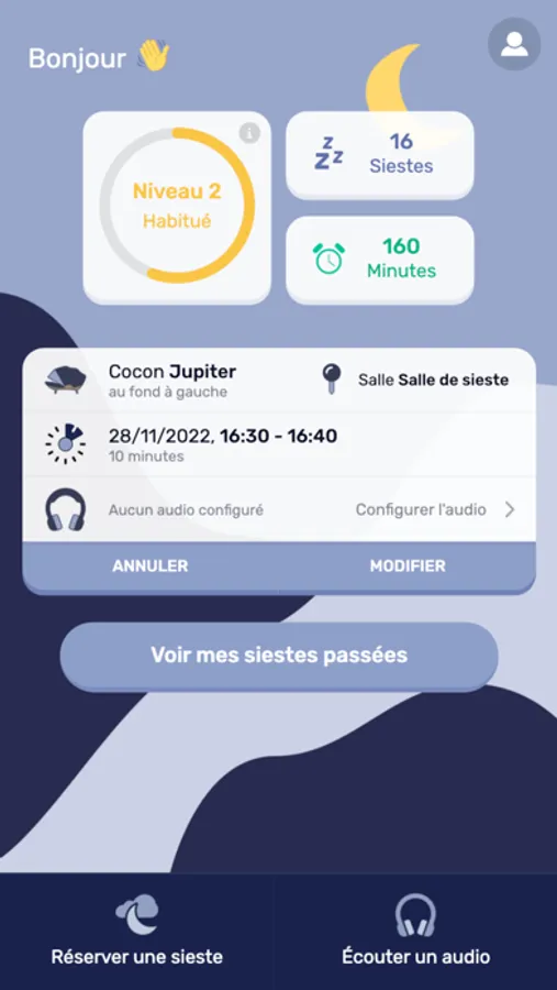 We designed this application to offer you the best napping experience through two services: the booking of a nap slot and access to relaxation audios.
